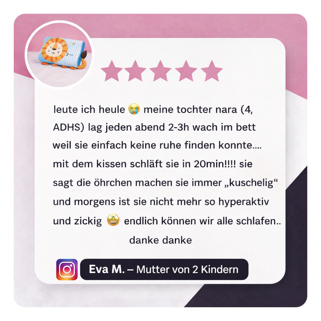Unser Sohn war abends immer total aufgedreht. Mit dem Löwen-Kissen kommt er viel schneller runter und schläft ruhiger ein.